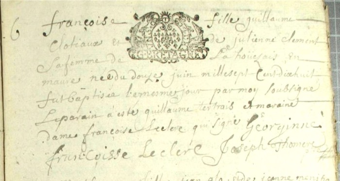 Françoise Cloteau [dau. of Guillaume Cloteau & Julienne Clément] Baptism (Sainte-Marie-Madeleine de Campel Catholic Church, Campel,, Ille-et-Vilaine, Brittany, France; 12 Jun 1718; B) [10 NUM 35048 151] [p 6 of 12, 1718-1718] (Greffe)