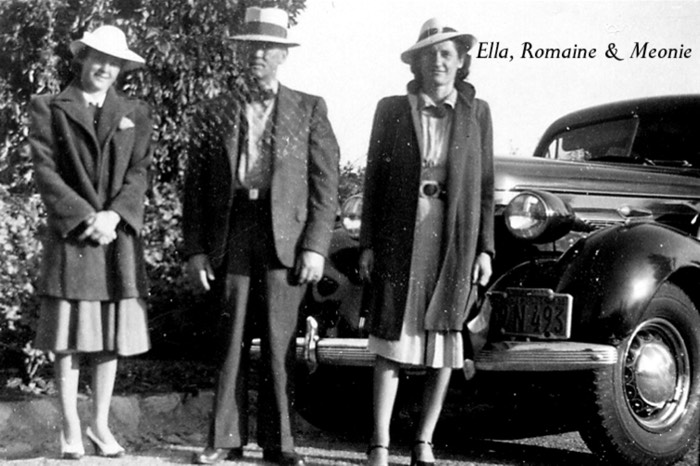 [Ella Clotiaux (left) with her father Romain C. Clotiaux and her cousin Meonie Hébert (dark hat band)]