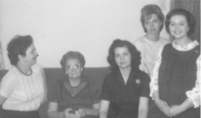 [Left to Right: Ella Aline Collier, Stella Lee Weatherford, Stella Bernell Collier, Joan Ann Weale (wife of Thomas Jefferson Collier Jr.) and Beverly Jo Annen (wife of David Leo Clotiaux). Photograph taken in early 1967 at a baby shower for Beverly Jo Annen at the John Francis Cupp Jr. home at 10617 Pillot in Houston, Texas.]