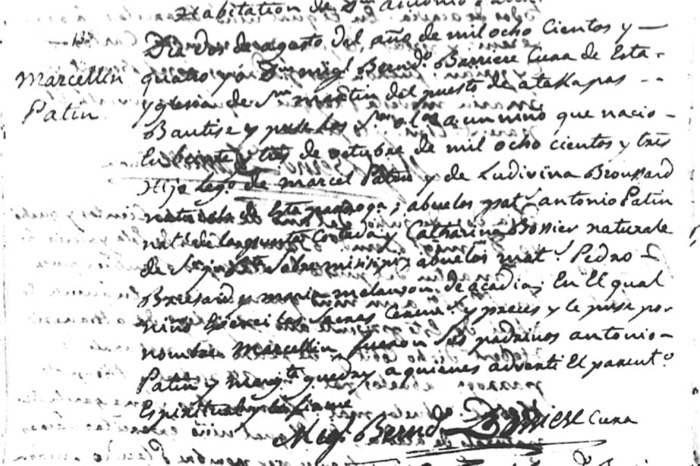 Marcellin Patin Baptism (v. 6 #138; St. Martin de Tours Catholic Church; St. Martinville, St. Martin Parish, LA)
