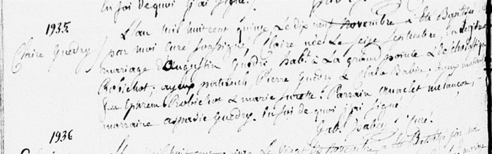 Claire Guedry Baptism (v. 6 #1935-[sic - v. 7 #1935]; St. Martin de Tours Catholic Church; St. Martinville, St. Martin Parish, LA)